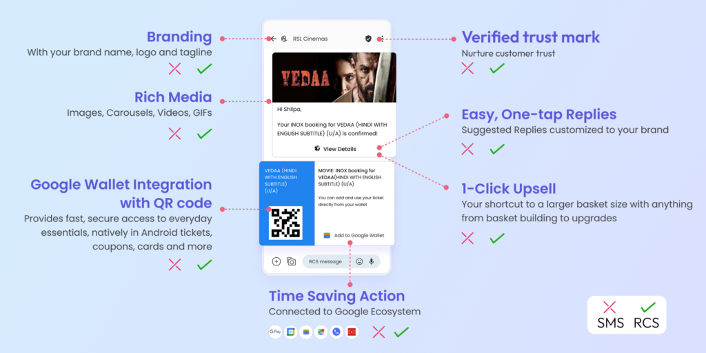 RCS isn’t just an upgrade to messaging—it’s a complete reinvention. While MMS unlocked basic multimedia capabilities beyond text-only SMS, RCS catapults business messaging into an entirely different league with experiences that feel native to today’s digital landscape.
