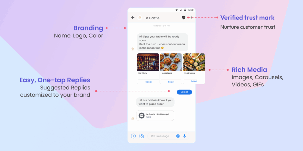 RCS vs. SMS reveals the massive upgrade: While SMS limits you to 160 characters of plain text, RCS allows users to send up to 250,000 characters at once and incorporates multimedia such as high-resolution images, gifs, carousels, audio, video and calendar integrations. More importantly, RCS provides verified sender capability, ensuring customers know they’re talking to legitimate businesses.